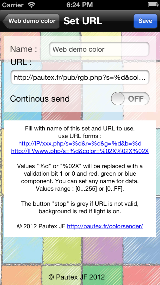 Color sender uses an URL to send a color settings and one enable bit. It is therefore possible to control a RGB lamp connected to internet with a URL command, a DIY lamp of this type is described here :