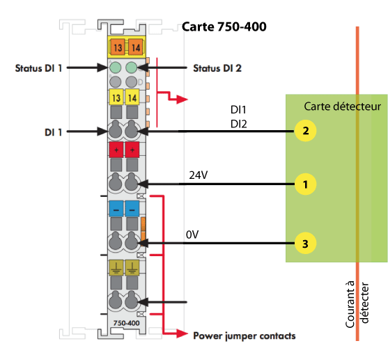 Ce dispositif de mesure sera ensuite connecté sur une carte d'entrée digitale 0-24V (750-400) d'un automate WAGO (750-841 ou 750-341 moins coûteux), la conception du capteur