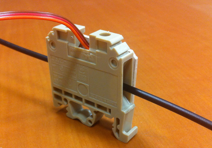 Le dispositif est installé dans une borne électrique évidée. Le câble mesuré (2,5 mm2) traverse le tore de mesure.