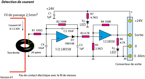 Le capteur est une bobine de 20 spires de fil fin sur un tore de ferrite. Le fil le traversant est l'un des fils d'alimentation